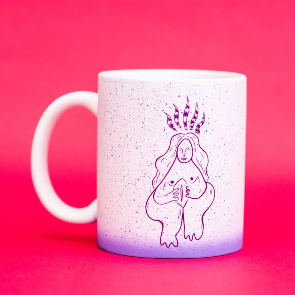 Caneca Porcelana Branca com degradê em lilás na estampa Vênus de Willendorf