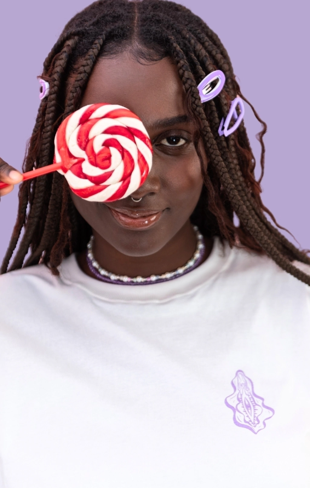 Tshirt na cor off-white estampa serigráfica Dentada na cor roxa